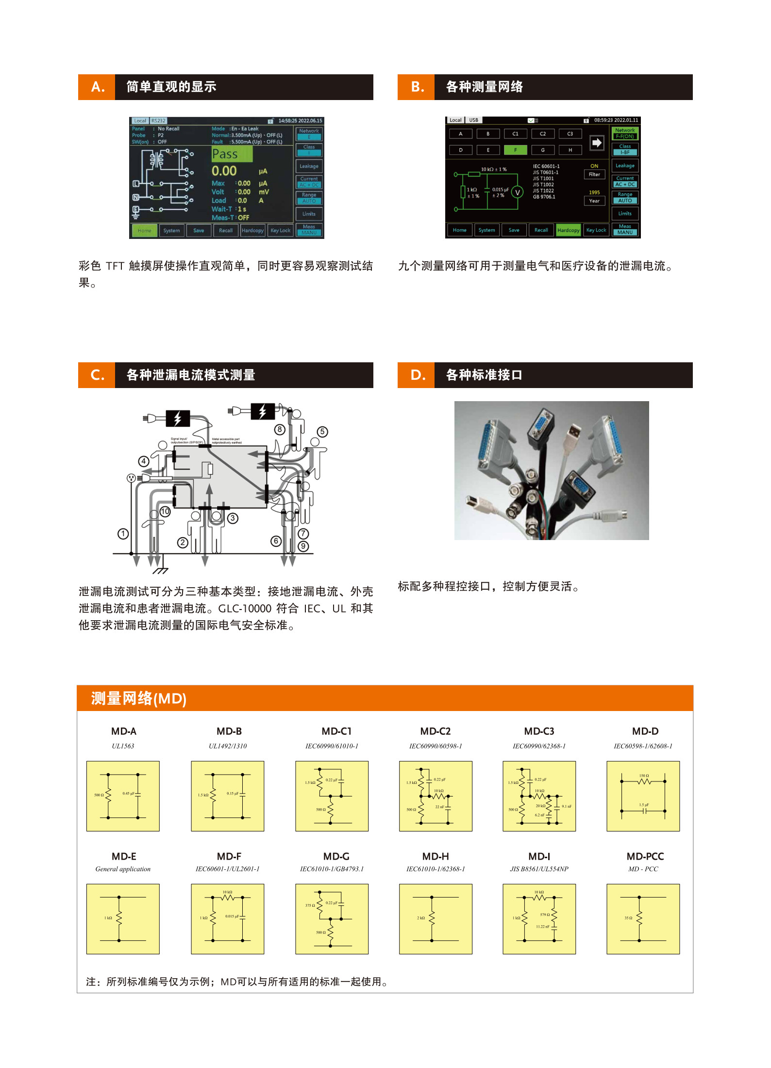 GLC-10000 提供了大多数 IT 产品、家用电器和其他电子仪器设备,甚至是医疗电子设备在漏电流(或接触电流)测量方面的测试要求,包括所需的测量网络、各种电流形式的测量频宽,都符合法规的*新版本要求。此外,为了符合不同法规下的漏电流流路,GLC-10000 提供了 20 种测量选项,以满足旧版和*新版的标准要求。